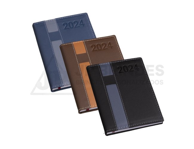Agenda diária 2024 de couro sintético com suporte para caneta. Contém fita de cetim marca página, dados pessoais, calendário de 2023 à 2025, mapa do Brasil, mapa-múndi, índice telefônico e planejamento. Não acompanha caneta.