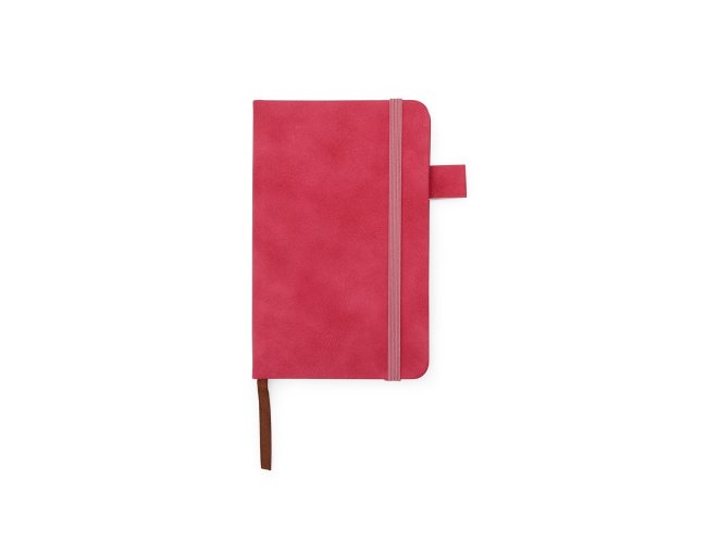 Caderneta em PU com marcador de página em cetim e fita elástica para fechar. Contém aproximadamente 80 folhas amareladas sem pauta.
