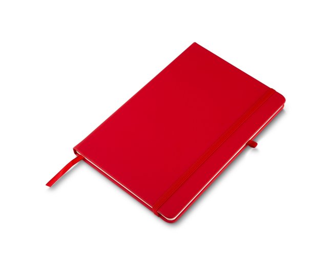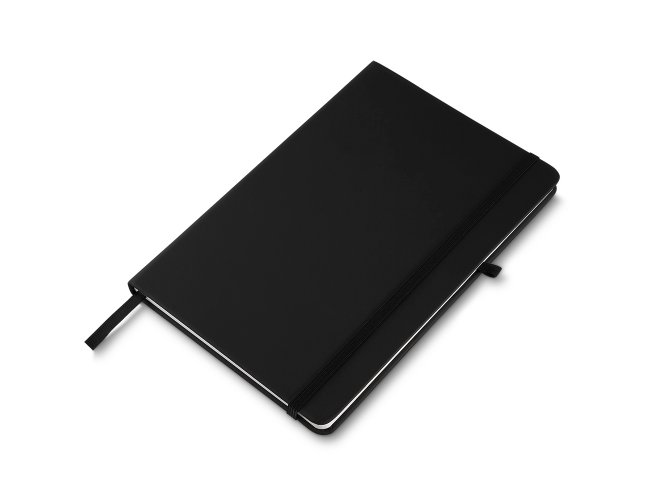 Caderneta emborrachada com porta caneta elástico em nylon, marcador de página em cetim e fita elástica de nylon para fechar. Contém aproximadamente 72 folhas pardas pautadas.