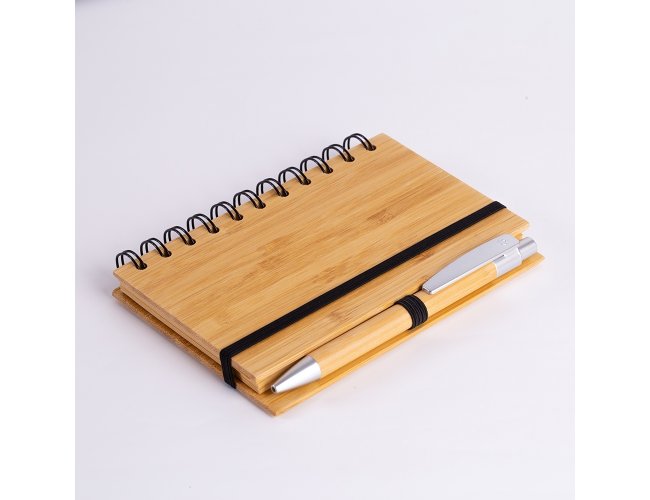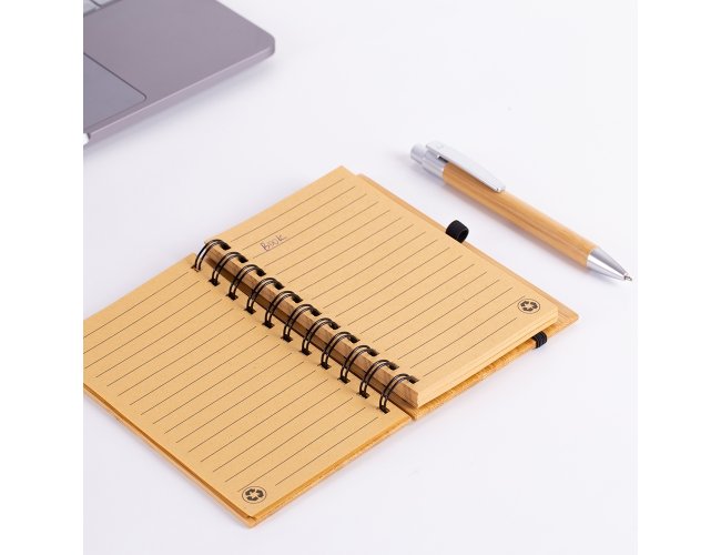 Caderno ecológico com caneta. Capa de bambu. Possui aproximadamente 70 folhas beges pautadas com logo reciclado na lateral inferior. Acompanha suporte elástico de nylon com uma caneta de bambu de detalhes plásticos.