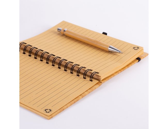 Caderno ecológico com caneta. Capa de bambu. Possui aproximadamente 70 folhas beges pautadas com logo reciclado na lateral inferior. Acompanha suporte elástico de nylon com uma caneta de bambu com detalhes em metal.