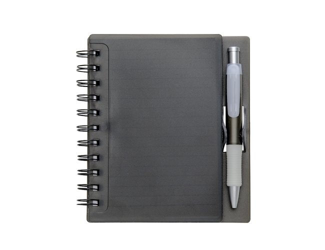 Caderno plástica wire-o com caneta e suporte para encaixe. Caneta plástica com detalhe emborrachado, carga esferográfica na cor azul e acionamento por clique.