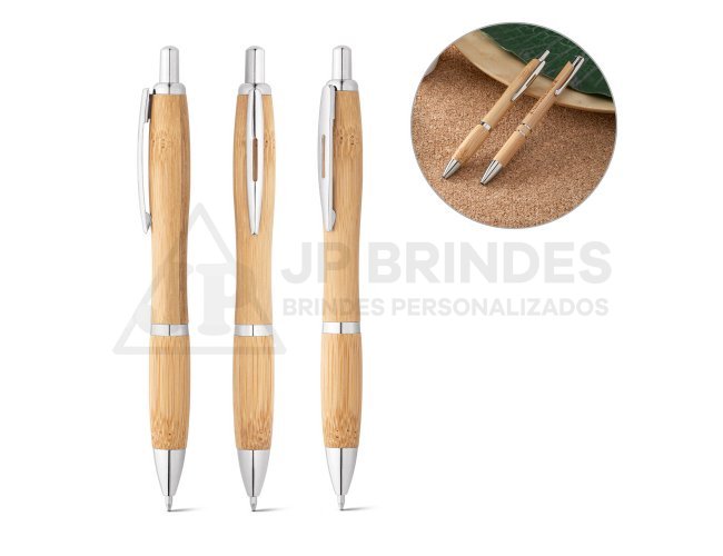 Caneta de papel reciclado com detalhes plásticos, carga esferográfica azul e acionamento por clique.